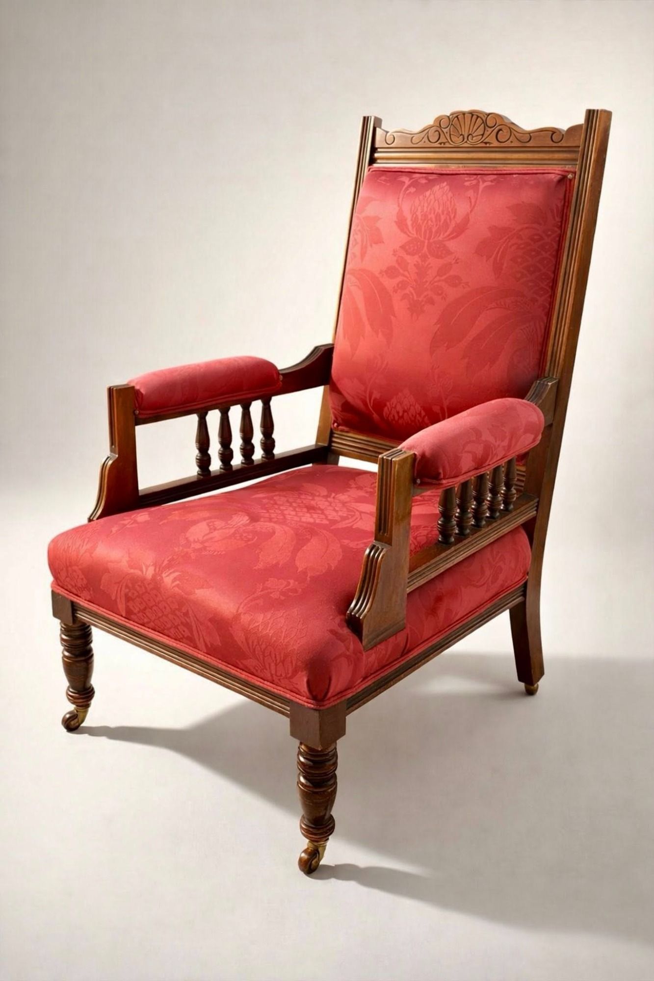 Beautiful antique Victorian armchair featuring a padded back with an elegant foliate carved top rail, over scrolled arms, and turned legs. It is upholstered in a reddish dark pink patterned fabric.