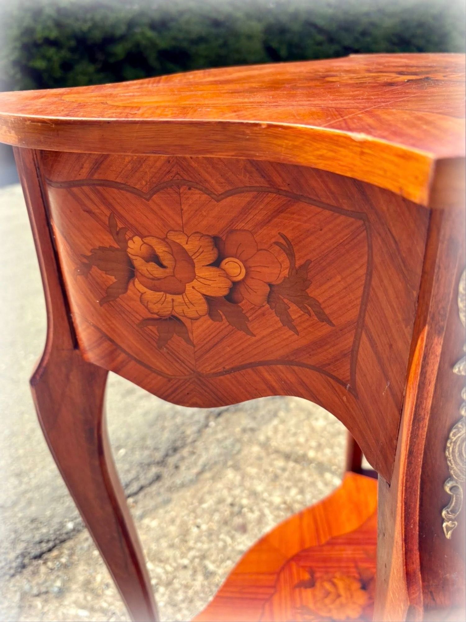It features intricate floral inlay, elegant cabriole legs, and detailed brass mounts.