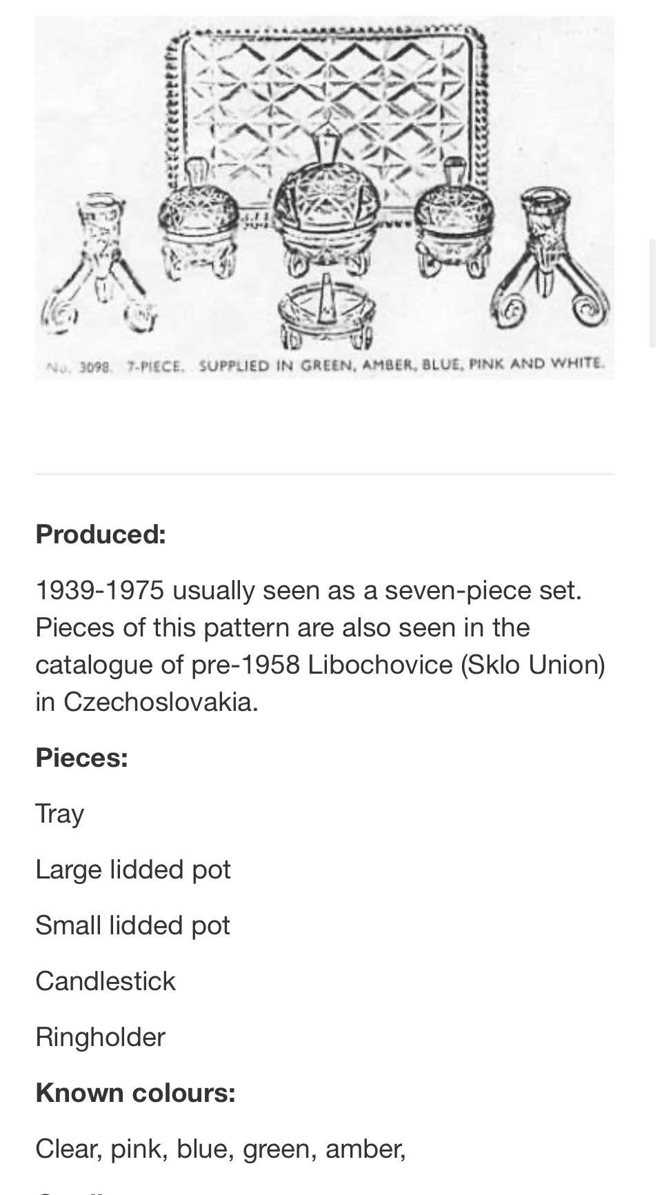 Beautiful vintage Bagley ‘State 3098’ pattern pink glass dressing table vanity set. A lovely decorative set that would look stunning on a dressing table or vanity and is perfect for collectors of vintage glass.
