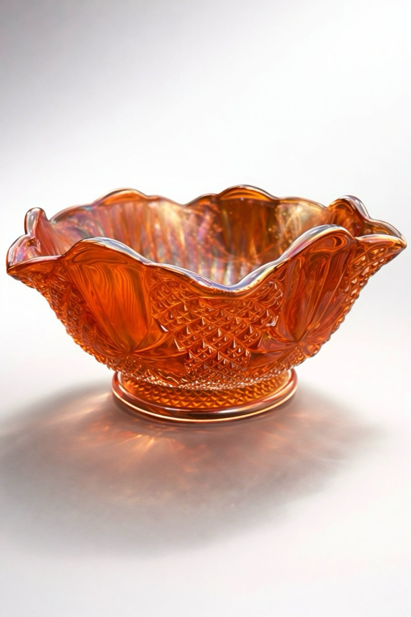 These stunning pressed glass dishes feature the classic iridescent rainbow sheen and decorative ruffled edges that make carnival glass so collectible.