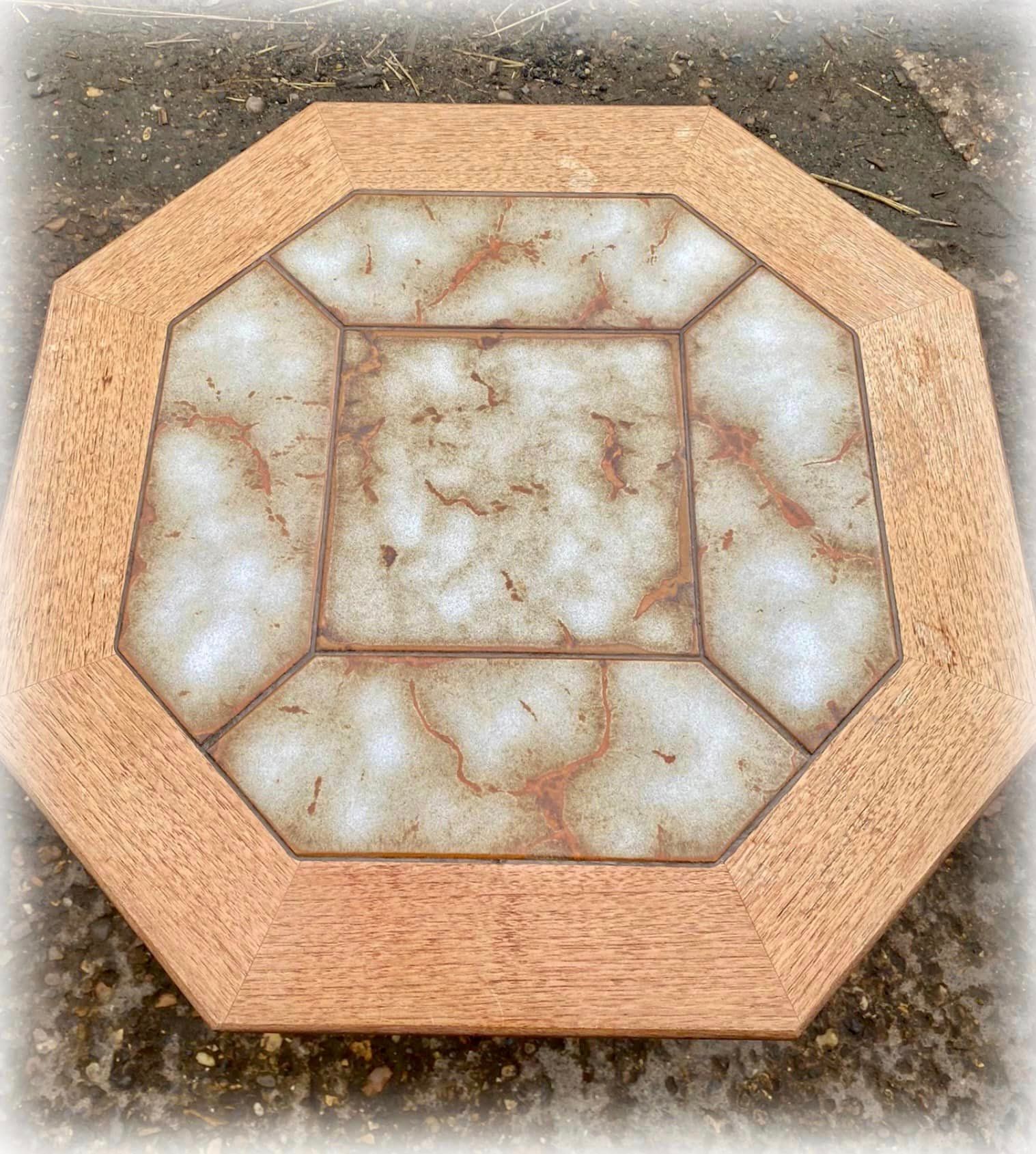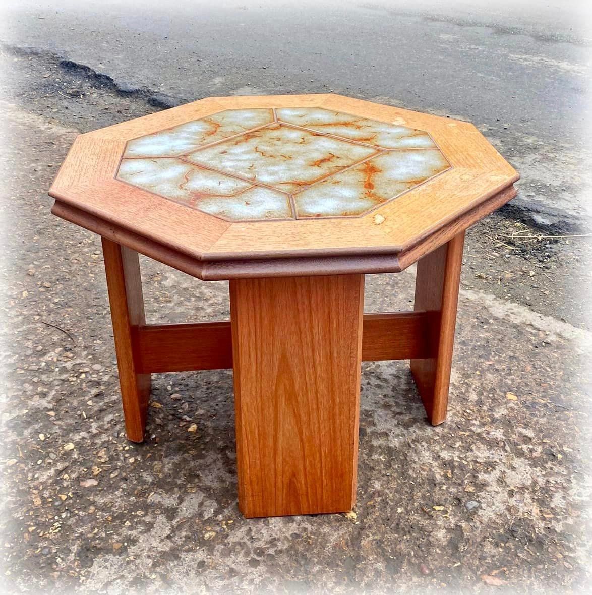 A stylish G-Plan hexagonal coffee table in true mid-century modern style, featuring a durable tiled top and sleek wooden frame.