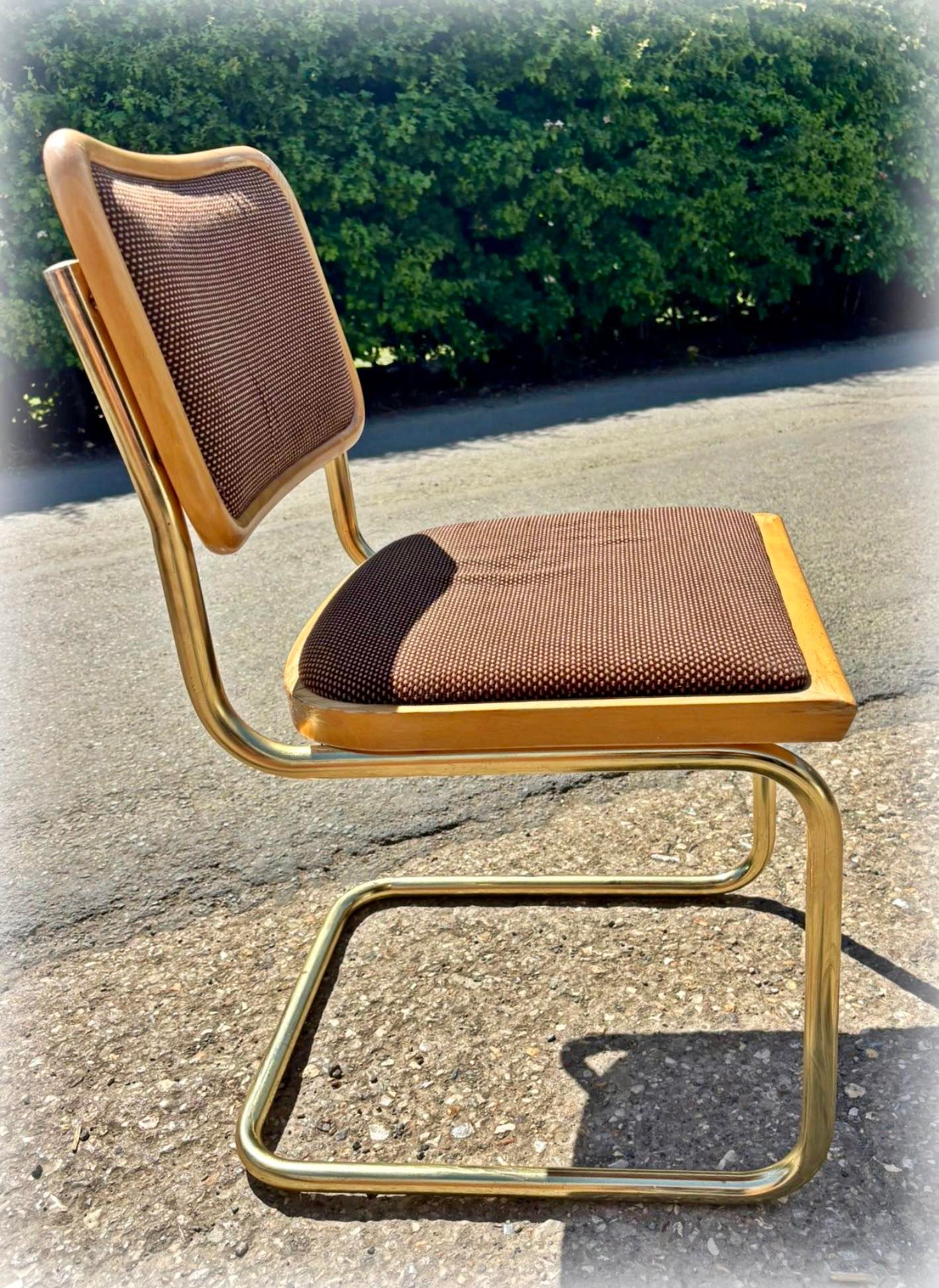 The chairs have brown woven seats and backrests with a light-colored wood frame, and a gold-colored metal base