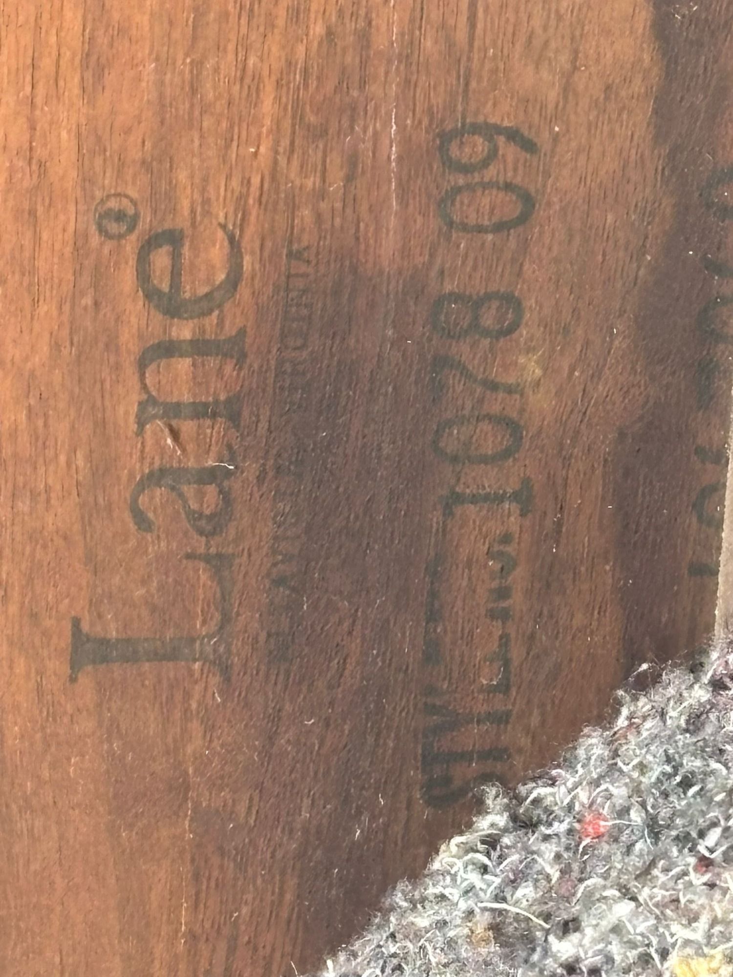 A long coffee table by Lane Furniture (Altavista, Virginia), featuring a walnut frame and faux stone top – the perfect touch of mid-century modern style.