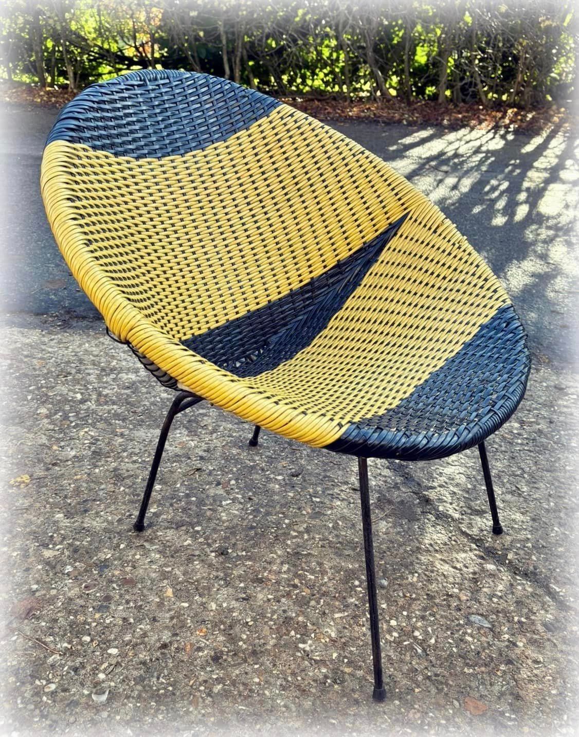It features an iron frame and legs with a two-tone intricately woven laminated rattan seat in yellow and black.
