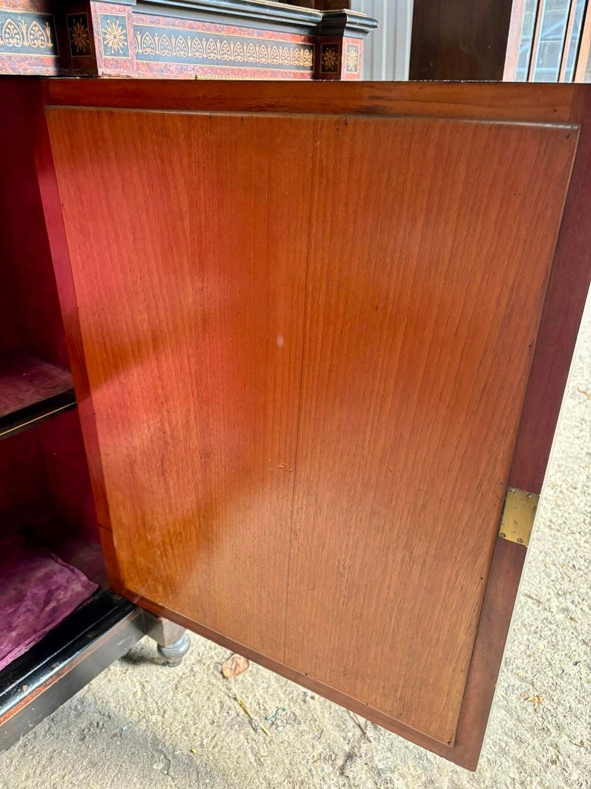 The Aesthetic Movement (1870s–1880s) emerged as a response to Victorian mass production, emphasising craftsmanship and artistic design—qualities that are evident in this exquisite cabinet.
